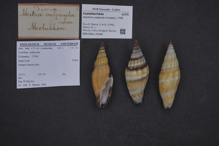 Keywords: Naturalis Biodiversity Center - ZMA.MOLL.72340 - Vexillum vulpecula (Linnaeus, 1758) - Costellariidae - Mollusc shell.jpeg artwork Dimensions artwork Document type Costellariidae Vexillum Individual count Infraspecific epithet Infraspecific rank Institution Naturalis Kind of unit artwork Kind of unit specimen shell Life stage Mactan Cebu dredged Mactan Sulu; lat 10 21 lon 123 76 Medium artwork Nomenclatural code Collection remarks Moll Source institute Zoölogisch Museum Amsterdam Scale the width of the text on the species/QR-code label is 38 mm Occurrence ID page Neogastropoda Other fields Other versions artwork Permission license Naturalis donation CC-0 Mollusca Publication location Scientific name Vexillum vulpecula Linnaeus 1758 Scientific name authorship Linnaeus 1758 Source url http //bioportal naturalis nl Specific epithet vulpecula State or province Cebu Subject keywords artwork Subject keywords publication Title artwork Title publication Type status Uploaded with GWToolset Naturalis_Biodiversity_Center_-_ZMA MOLL 72340_-_Vexillum_vulpecula_ Linnaeus _1758 _-_Costellariidae_-_Mollusc_shell http //medialib naturalis nl/file/id/ZMA MOLL 72340/format/large Molluscs at Naturalis from the Zoölogisch Museum Amsterdam Media donated by Naturalis Biodiversity Center Vexillum vulpecula Vexillum |