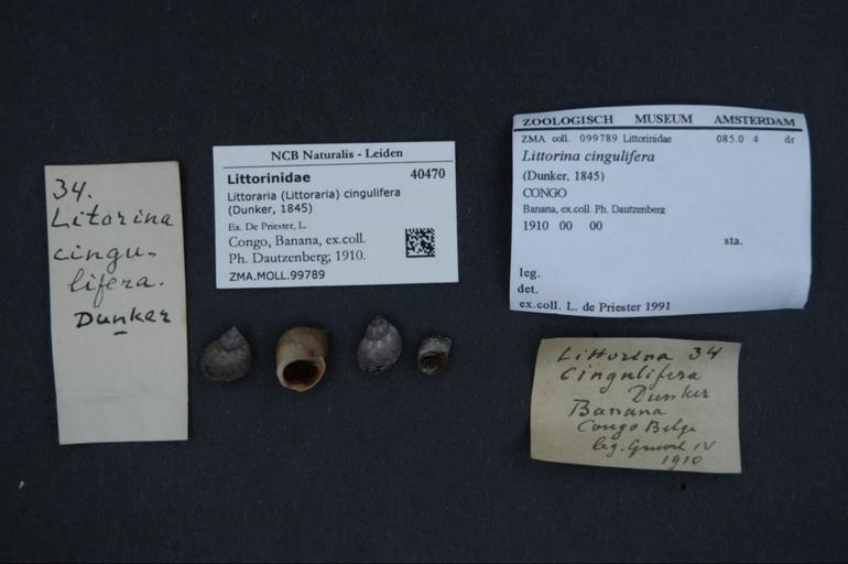 | Keywords: Naturalis Biodiversity Center - ZMA.MOLL.99789 - Littoraria (Littoraria) cingulifera (Dunker, 1845) - Littorinidae - Mollusc shell.jpeg artwork Dimensions artwork Document type Littorinidae subfamily Littorininae Littoraria Individual count Infraspecific epithet Infraspecific rank Institution Naturalis Kind of unit artwork Kind of unit specimen shell Life stage Congo Banana ex coll Ph Dautzenberg; 1910 Medium artwork Nomenclatural code coll Source institute Zoölogisch Museum Amsterdam Scale the width of the text on the species/QR-code label is 38 mm Occurrence ID page Other fields Other versions artwork Permission license Naturalis donation CC-0 Mollusca Publication location Scientific name Littoraria Littoraria cingulifera Dunker 1845 Scientific name authorship Dunker 1845 Source url http //bioportal naturalis nl Specific epithet cingulifera State or province Subject keywords artwork Subject keywords publication Title artwork Title publication Type status Uploaded with GWToolset Naturalis_Biodiversity_Center_-_ZMA MOLL 99789_-_Littoraria_ Littoraria _cingulifera_ Dunker _1845 _-_Littorinidae_-_Mollusc_shell http //medialib naturalis nl/file/id/ZMA MOLL 99789/format/large Molluscs at Naturalis from the Zoölogisch Museum Amsterdam Media donated by Naturalis Biodiversity Center Littoraria cingulifera Littoraria |