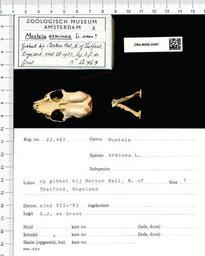 Keywords: Naturalis Biodiversity Center - ZMA.MAM.22467 pal - Mustela erminea Linnaeus - skull.jpeg artwork Dimensions artwork Document type Mustela Individual count 1 Infraspecific epithet Infraspecific rank Institution Naturalis Kind of unit artwork Kind of unit specimen skull Life stage UNITED KINGDOM Thetford Merton Hall Medium artwork Nomenclatural code Occurrence ID page Other fields Other versions artwork Permission license Naturalis donation CC-0 Publication location Scientific name Mustela erminea Linnaeus Scientific name authorship Linnaeus unknown Source url http //bioportal naturalis nl Specific epithet erminea State or province Subject keywords artwork Subject keywords publication Title artwork Title publication Type status Uploaded with GWToolset Naturalis_Biodiversity_Center_-_ZMA MAM 22467_pal_-_Mustela_erminea_Linnaeus_-_skull http //medialib naturalis nl/file/id/ZMA MAM 22467_pal/format/large Mammals at Naturalis from the Zoölogisch Museum Amsterdam Media donated by Naturalis Biodiversity Center Mustela erminea Mustela |