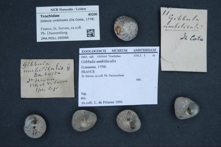 | Keywords: Naturalis Biodiversity Center - ZMA.MOLL.100066 - Gibbula umbilicalis (Da Costa, 1778) - Trochidae - Mollusc shell.jpeg artwork Dimensions artwork Document type Trochidae subfamily Gibbulinae Gibbula Individual count Infraspecific epithet Infraspecific rank Institution Naturalis Kind of unit artwork Kind of unit specimen shell Life stage France St Servan ex coll Ph Dautzenberg Medium artwork Nomenclatural code coll Scale the width of the text on the species/QR-code label is 38 mm Occurrence ID page Other fields Other versions artwork Permission license Naturalis donation CC-0 Mollusca Publication location Scientific name Gibbula umbilicalis Da Costa 1778 Scientific name authorship Da Costa 1778 Source url http //bioportal naturalis nl Specific epithet umbilicalis State or province Ille-et-Vilaine Subject keywords artwork Subject keywords publication Title artwork Title publication Type status Uploaded with GWToolset Naturalis_Biodiversity_Center_-_ZMA MOLL 100066_-_Gibbula_umbilicalis_ Da_Costa _1778 _-_Trochidae_-_Mollusc_shell http //medialib naturalis nl/file/id/ZMA MOLL 100066/format/large Media donated by Naturalis Biodiversity Center Molluscs at Naturalis from the Zoölogisch Museum Amsterdam Gibbula umbilicalis Gibbula |