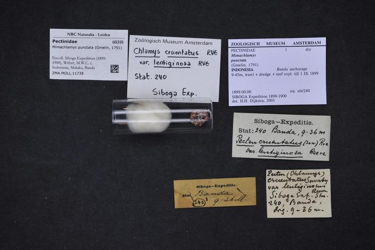 | Keywords: Naturalis Biodiversity Center - ZMA.MOLL.11738 - Mimachlamys punctata (Gmelin, 1791) - Pectinidae - Mollusc shell.jpeg artwork Dimensions artwork Document type Pectinidae subfamily Chlamydinae Mimachlamys Dijkstra H H Individual count Infraspecific epithet Infraspecific rank Institution Naturalis Kind of unit artwork Kind of unit specimen shell Life stage Indonesia Maluku Banda anchorage 9-45 m black sand coral Lithothamnion-bank in 18-36 m trawl dredge reef-exploration; lat -4 5398 lon 129 9084; 1-xii-1899 stn sib/240 Medium artwork Nomenclatural code Collection remarks Moll Scale the width of the text on the species/QR-code label is 38 mm Occurrence ID page Pectinoida Other fields Other versions artwork Permission license Naturalis donation CC-0 Mollusca Publication location Scientific name Mimachlamys punctata Gmelin 1791 Scientific name authorship Gmelin 1791 Source url http //bioportal naturalis nl Specific epithet punctata State or province Maluku Subject keywords artwork Subject keywords publication Title artwork Title publication Type status Uploaded with GWToolset Naturalis_Biodiversity_Center_-_ZMA MOLL 11738_-_Mimachlamys_punctata_ Gmelin _1791 _-_Pectinidae_-_Mollusc_shell http //medialib naturalis nl/file/id/ZMA MOLL 11738/format/large Media donated by Naturalis Biodiversity Center Molluscs at Naturalis from the Zoölogisch Museum Amsterdam Mimachlamys punctata |