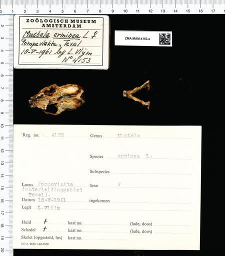 Keywords: Naturalis Biodiversity Center - ZMA.MAM.4153.a pal - Mustela erminea Linnaeus - skull.jpeg artwork Dimensions artwork Document type Mustela Individual count 1 Infraspecific epithet Infraspecific rank Institution Naturalis Kind of unit artwork Kind of unit specimen skull Life stage Netherlands Noord Holland Texel Medium artwork Nomenclatural code Occurrence ID page Other fields Other versions artwork Permission license Naturalis donation CC-0 Publication location Scientific name Mustela erminea Linnaeus Scientific name authorship Linnaeus female Source url http //bioportal naturalis nl Specific epithet erminea State or province Noord Holland Subject keywords artwork Subject keywords publication Title artwork Title publication Type status Uploaded with GWToolset Naturalis_Biodiversity_Center_-_ZMA MAM 4153 a_pal_-_Mustela_erminea_Linnaeus_-_skull http //medialib naturalis nl/file/id/ZMA MAM 4153 a_pal/format/large Mammals at Naturalis from the Zoölogisch Museum Amsterdam Media donated by Naturalis Biodiversity Center Mustela erminea Mustela