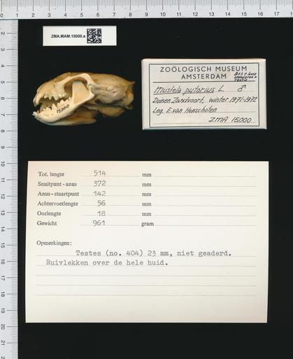 | Keywords: Naturalis Biodiversity Center - ZMA.MAM.15000.a lat - Mustela putorius Linnaeus - skull.jpeg artwork Dimensions artwork Document type Mustela Individual count 1 Infraspecific epithet Infraspecific rank Institution Naturalis Kind of unit artwork Kind of unit specimen skull Life stage Netherlands Noord Holland Zandvoort Medium artwork Nomenclatural code Occurrence ID page Other fields Other versions artwork Permission license Naturalis donation CC-0 Publication location Scientific name Mustela putorius Linnaeus Scientific name authorship Linnaeus male Source url http //bioportal naturalis nl Specific epithet putorius State or province Noord Holland Subject keywords artwork Subject keywords publication Title artwork Title publication Type status Uploaded with GWToolset Naturalis_Biodiversity_Center_-_ZMA MAM 15000 a_lat_-_Mustela_putorius_Linnaeus_-_skull http //medialib naturalis nl/file/id/ZMA MAM 15000 a_lat/format/large Mammals at Naturalis from the Zoölogisch Museum Amsterdam Media donated by Naturalis Biodiversity Center Mustela putorius Mustela |
