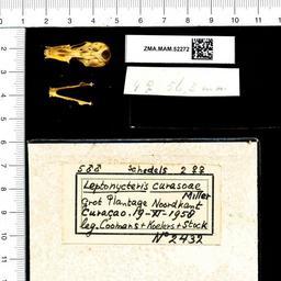 Keywords: Naturalis Biodiversity Center - ZMA.MAM.52272 pal - Leptonycteris curasoae - skull.jpeg artwork Dimensions artwork Document type Leptonycteris Individual count 1 Infraspecific epithet Infraspecific rank Institution Naturalis Kind of unit artwork Kind of unit specimen skull Life stage Grot Plantage Noordkant CuraƧao Medium artwork Nomenclatural code Occurrence ID page Other fields Other versions artwork Permission license Naturalis donation CC-0 Publication location Scientific name Leptonycteris curasoae Scientific name authorship female Source url http //bioportal naturalis nl Specific epithet curasoae State or province Subject keywords artwork Subject keywords publication Title artwork Title publication Type status Uploaded with GWToolset Naturalis_Biodiversity_Center_-_ZMA MAM 52272_pal_-_Leptonycteris_curasoae_-_skull http //medialib naturalis nl/file/id/ZMA MAM 52272_pal/format/large Mammals at Naturalis from the Zoƶlogisch Museum Amsterdam Media donated by Naturalis Biodiversity Center Leptonycteris curasoae Leptonycteris |