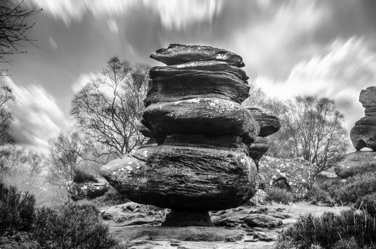 Keywords: nature shapes england sky cloudy trees brimham rocks sedimentary landscape formation yorkshire nidderdale rocks stones weather holiday black white