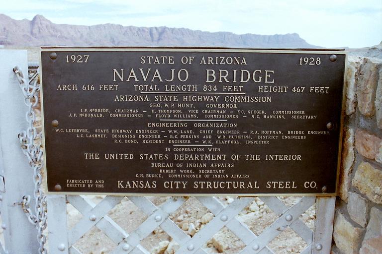 Keywords: Navajobridge03.jpg Navajo Bridge crosses the Colorado River at Marble Canyon Arizona southwest of Page in northern Arizona United States Navajo Bridge überquert den Colorado River bei Page in Arizona Vereinigte Staaten own 1998-05-11 Nikater Own work all rights released Public domain Navajo Bridge Plaque Plaques in Arizona Navajo Bridge Bridge nameplates Bridge manufacturer's plates History of Coconino County Arizona Navajo Bridge |
