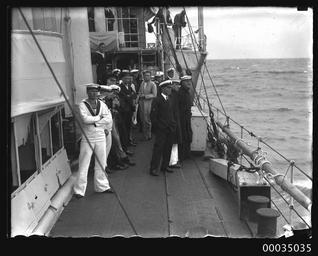 | Keywords: hood collection hoodcollection 35035 samuel j hood collection samueljhoodcollection hmas torrens hmastorrens torrens royal australian navy royalaustraliannavy navy naval vessel navalvessel sinking scuttled scuttling 1930 destroyer sydney sydney heads sydneyheads hmas anzac blackandwhite monochrome outdoor photo border black and white Having served in the Royal Australian Navy from 1916, latterly as a training platform for the Naval Reserve, HMAS TORRENS I was decommissioned and prepared as a target for Fleet Gunnery Practice. On 24 November 1930 Samuel J Hood, who was probably on board HMAS ANZAC, photographed the sinking of TORRENS off Sydney Heads. Royal Australian Navy officers and sailors are depicted here, probably on board ANZAC, witnessing the sinking. This photo is part of the Australian National Maritime Museum’s Samuel J. Hood Studio collection. Sam Hood (1872-1953) was a Sydney photographer with a passion for ships. His 60-year career spanned the romantic age of sail and two world wars. The photos in the collection were taken mainly in Sydney and Newcastle during the first half of the 20th century. The ANMM undertakes research and accepts public comments that enhance the information we hold about images in our collection. This record has been updated accordingly. Photographer: Samuel J. Hood Studio Collection Object no. 00035035 Having served in the Royal Australian Navy from 1916, latterly as a training platform for the Naval Reserve, HMAS TORRENS I was decommissioned and prepared as a target for Fleet Gunnery Practice. On 24 November 1930 Samuel J Hood, who was probably on board HMAS ANZAC, photographed the sinking of TORRENS off Sydney Heads. Royal Australian Navy officers and sailors are depicted here, probably on board ANZAC, witnessing the sinking. This photo is part of the Australian National Maritime Museum’s Samuel J. Hood Studio collection. Sam Hood (1872-1953) was a Sydney photographer with a passion for ships. His 60-year career spanned the romantic age of sail and two world wars. The photos in the collection were taken mainly in Sydney and Newcastle during the first half of the 20th century. The ANMM undertakes research and accepts public comments that enhance the information we hold about images in our collection. This record has been updated accordingly. Photographer: Samuel J. Hood Studio Collection Object no. 00035035 |