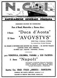 Keywords: Navigazione-Generale-Italiana-1927.jpg it Navigazione Generale Italiana annuncio pubblicitario della partenza delle motonavi DUCA D'AOSTA e AUGUSTUS dal porto di Napoli il 2 e il 13 gennaio 1927 dirette in Venezuela Colombia Panamà e Sud Pacifico Agente Gen SDAD - Italia - America - Barcellona Rambla de Santa Monica 1 e 3 succursale a Madrid calle Alcalà 47 1927-12-29 La Vanguardia Barcelona 29 diciembre 1927 pag 10 Navigazione Generale Italiana PD-old La Vanguardia advertisements 1927 Advertisements in Spain 1927 Shipping line advertisements 1927 advertisements in Spain Navigazione Generale Italiana |