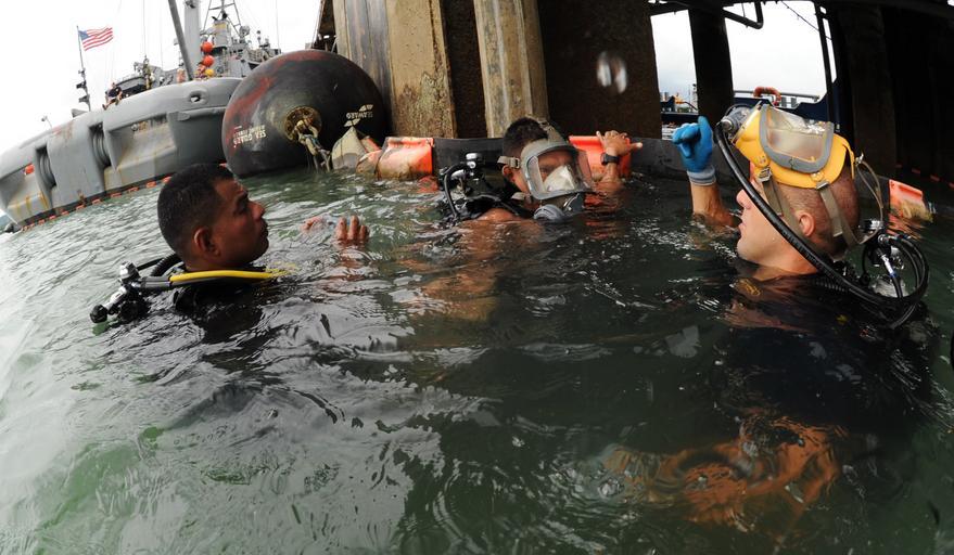 | Keywords: Navy Diver - Southern Partnership Station DVIDS309393.jpg en Petty Officer 2nd Class Jason Hatch briefs safety procedures to Panamanian divers prior to conducting pier searches during joint diving training aboard the Military Sealift Command search and rescue ship USNS Grasp Mobile Diving and Salvage Unit 2 is participating in the Navy Diver-Southern Partnership Station exercise a multinational partnership engagement designed to increase interoperability and partner nation capacity through diving operations 2010-08-12 Petty Officer 2nd Class Jayme Pastoric https //www dvidshub net/image/309393 100812-N-+++++-034 2010-08-14 18 55 PANAMA CITY PA PD-USGov-Military-Navy United States Navy Mobile Diving and Salvage Unit Two Images from DoD uploaded by Fæ |