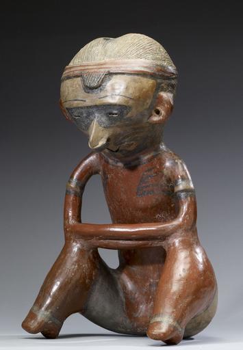 | Keywords: Nayarit - Seated Male - Walters 20092061 - View A.jpg Lagunillas figures often portray men usually in a seated position with elbows resting on bent knees and forearms crossed on top of each other The torso leans forward and the face gazes downward This figure's loins are wrapped in a relatively wide hip cloth of unadorned fabric He wears a textile or plant fiber triple-strand band around his head a forelock of hair falling below the band His face is extensively painted with black designs including masklike half circles around his eyes and whisker-like motifs extending outward from the corners of his mouth Arm and ankle bands perhaps made of cut shell adorn his limbs; similar multi-stringed ornaments have been found adorning corporeal remains in many tombs from this region 300 BC-AD 200 burnished earthenware slip paint cm 46 2 27 2 35 4 accession number 2009 20 61 80216 Stendahl Galleries Los Angeles date and mode of acquisition unknown John G Bourne 1960s by purchase Walters Art Museum Gift of John Bourne 2009 place of origin Nayarit Mexico Walters Art Museum license Nayarit Pre-Columbian pottery in the Walters Art Museum Nayarit pottery Media contributed by the Walters Art Museum needs category review |