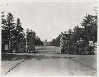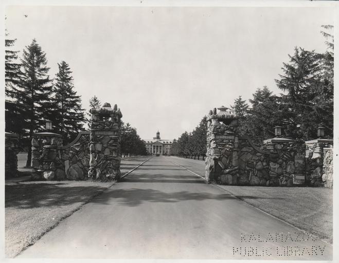 Keywords: kalamazoo public library michigan history photography college school nazareth gull road stone columns cupola building architecture outdoor snow Exterior view of Nazareth College, Gull Road. View looking north through the stone entrance. Center building, with four columns and cupola, in the distance at end of driveway. KPL catalogue number P-1046. Exterior view of Nazareth College, Gull Road. View looking north through the stone entrance. Center building, with four columns and cupola, in the distance at end of driveway. KPL catalogue number P-1046. |