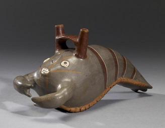 | Keywords: Nazca - Lobster Effigy Vessel - Walters 20092055 - Three Quarter.jpg The coast of Peru is bathed in the Humboldt Current which sweeps cold water from the Antarctic along the South American coast and northwards to Mexico and the Pacific Northwest Rich in plankton and other marine animals the Humboldt Current supports one of the world's most fertile fishing grounds Early Andean peoples harvested its bounty with fish and shellfish being a primary source of protein not only for coastal peoples but also those in the highlands This lobster effigy vessel with its small bridge-spout handle typical of Nasca ceramics is a masterful example of the ceramic effigy vessel form AD 300-600 Early Intermediate Phases IIII-IV earthenware slip paint H 5 5/16 x L 9 1/2 x W 4 1/8 in 13 49 x 24 13 x 10 41 cm accession number 2009 20 55 80210 Economos Works of Art date and mode of acquisition unknown John G Bourne 1990s by purchase Walters Art Museum Gift of John Bourne 2009 place of origin South Coast Walters Art Museum license Pre-Columbian art in the Walters Art Museum Nazca double spouted ceramic vessels Media contributed by the Walters Art Museum needs category review Lobsters in art Animals in Pre-Columbian art Nazca ceramic effigy vessels |