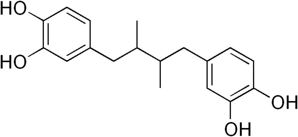 Keywords: NDGA.png chemical structure of nordihydroguaiaretic acid own 16 25 24 August 2007 UTC Edgar181 Phenylpropanoids Catechols