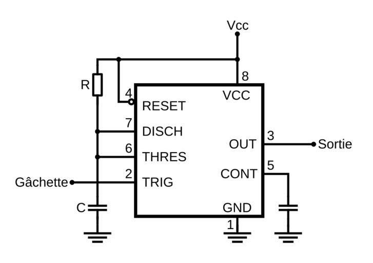 Keywords: NE555 Monostable Diagram fr.svg NE555 monostable configuration schematics Own 2007-09-25 BlanchardJ Created with Inkscape ElCompLib 555 timer IC Monostable circuits with 555 timer