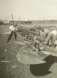 Keywords: NEA0687No.3AircraftDepot1945.jpg Amberley Qld At No 3 Aircraft Depot RAAF removing camouflage paint from Spitfire Mk VIII aircraft Nearest camera 170172 Leading Aircraftman LAC E A C Richardson flight rigger of Kedron Qld; centre 426145 LAC N G Neilson fitter IIA of Bundaberg Qld; 65677 LAC K J Sharp fitter IIA of Canowindra NSW The men are using paint remover and spatulas The Spitfire's cowlings are off revealing the Merlin engine in detail In the background are a Consolidated Liberator C-87 transport of the RAF DAP Beaufighter A8-129 of No 93 Squadron RAAF and two other Liberator aircraft NEA0687 Department of Air 1945-07-18 PD-Australia PD-1996 Australia Royal Australian Air Force in World War II Supermarine Spitfire Mark VIII Black and white photographs |