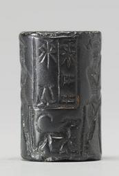 Keywords: Near Eastern - Cylinder Seal with Enkidu Vanquishing the Bull of Heaven - Walters 42786 - Side A.jpg At the center of the depicted scene is a handled jug on a stand Flanking this motif on both sides is an animal contest motif with a bearded hero/bull-man in horned headdress battling a bull-man At the edge of the scene is a cuneiform inscription in two registers at the top and beneath it is a small four legged animal with a long tail that curls upward between 1970 1670 BC early Old Babylonian; Babylon I hematite cm 2 3 1 4 accession number 42 786 3746 Sadie Jones Mrs Henry Walters New York date and mode of acquisition unknown Sale Joseph Brummer New York 1941 Walters Art Museum 1941 by purchase Museum purchase 1941 Inscription place of origin Mesopotamia Walters Art Museum license Cylinder seals in the Walters Art Museum Art of the ancient Near East Media contributed by the Walters Art Museum needs category review |