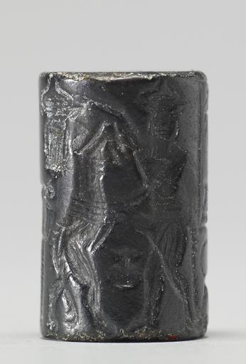 Keywords: Near Eastern - Cylinder Seal with Enkidu Vanquishing the Bull of Heaven - Walters 42786 - Side F.jpg At the center of the depicted scene is a handled jug on a stand Flanking this motif on both sides is an animal contest motif with a bearded hero/bull-man in horned headdress battling a bull-man At the edge of the scene is a cuneiform inscription in two registers at the top and beneath it is a small four legged animal with a long tail that curls upward between 1970 1670 BC early Old Babylonian; Babylon I hematite cm 2 3 1 4 accession number 42 786 3746 Sadie Jones Mrs Henry Walters New York date and mode of acquisition unknown Sale Joseph Brummer New York 1941 Walters Art Museum 1941 by purchase Museum purchase 1941 Inscription place of origin Mesopotamia Walters Art Museum license Cylinder seals in the Walters Art Museum Art of the ancient Near East Media contributed by the Walters Art Museum needs category review |