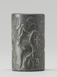Keywords: Near Eastern - Cylinder Seal with Four Beasts in Combat - Walters 42814 - Side E.jpg The scene on this seal depicts a lion attacking a horned quadruped A second horned quadruped is shown being attacked by a winged monster with talons Between these two sets of battling creatures is a small juglet suspended in the field There is a cuneiform inscription in two registers and above the registers is a disk with a star in it cradled in an inverted crescent between 1970 1670 BC early Old Babylonian; Babylon I hematite cm 2 1 2 accession number 42 814 27892 Sadie Jones Mrs Henry Walters New York date and mode of acquisition unknown Sale Joseph Brummer New York 1941 Walters Art Museum 1941 by purchase Museum purchase 1941 Inscription place of origin Mesopotamia Walters Art Museum license Cylinder seals in the Walters Art Museum Art of the ancient Near East Media contributed by the Walters Art Museum needs category review |
