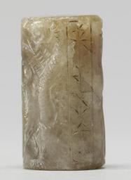 Keywords: Near Eastern - Cylinder Seal with Bull and Lion on Hind Legs - Walters 42720 - Side G.jpg The scene depicts two sets of battling beasts The first is a strangely posed bull-man wrestling with a fantastic lion-like creature; the second is another strangely posed bull-man wrestling with a composite horned caprid/bull creature There is one register of cuneiform date brown and white stone cm 2 9 1 5 accession number 42 720 8235 Sadie Jones Mrs Henry Walters New York date and mode of acquisition unknown Sale Joseph Brummer New York 1941 Walters Art Museum 1941 by purchase Museum purchase 1941 Inscription place of origin Mesopotamia Walters Art Museum license Cylinder seals in the Walters Art Museum Art of the ancient Near East Cuneiform on media Walters cylinder seal 42720 Cuneiform on cylinder seals Walters Art Museum cylinder seals with cuneiform IGI cuneiform Ši cuneiform Ud cuneiform DINGIR god-as-star Sumerogram Media contributed by the Walters Art Museum needs category review
