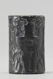 Keywords: Near Eastern - Cylinder Seal with Enkidu Vanquishing the Bull of Heaven - Walters 42786 - Side D.jpg At the center of the depicted scene is a handled jug on a stand Flanking this motif on both sides is an animal contest motif with a bearded hero/bull-man in horned headdress battling a bull-man At the edge of the scene is a cuneiform inscription in two registers at the top and beneath it is a small four legged animal with a long tail that curls upward between 1970 1670 BC early Old Babylonian; Babylon I hematite cm 2 3 1 4 accession number 42 786 3746 Sadie Jones Mrs Henry Walters New York date and mode of acquisition unknown Sale Joseph Brummer New York 1941 Walters Art Museum 1941 by purchase Museum purchase 1941 Inscription place of origin Mesopotamia Walters Art Museum license Cylinder seals in the Walters Art Museum Art of the ancient Near East Media contributed by the Walters Art Museum needs category review |