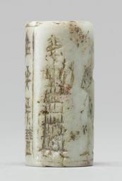 Keywords: Near Eastern - Cylinder Seal with Two Figures and Inscriptons - Walters 42669 - Side C.jpg The depicted scene features a man in a short tunic He faces a standing deity with a horned crown and long flounced robe with both arms raised The scene also incorporates a cuneiform inscription in four registers date Old Babylonian greenish-white stone cm 2 4 1 2 accession number 42 669 11359 Sadie Jones Mrs Henry Walters New York date and mode of acquisition unknown Sale Joseph Brummer New York 1941 Walters Art Museum 1941 by purchase Museum purchase 1941 Inscription place of origin Mesopotamia Walters Art Museum license Cylinder seals in the Walters Art Museum Art of the ancient Near East Inscription + 2 figures cylinder seal Walters 42669 Media contributed by the Walters Art Museum needs category review |