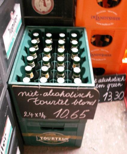 Keywords: NearBeersInWarehouse.JPG en A picture of some near-beers sold at the local warehouse Mark the Tourtel Jupiler NA and Palm Green sold out which are all near-beers Note that th price tag is in Euro and that 1/4 means 1/4 liter or 25cl own KVDP 2008-07-05 Bottle crates low quality |