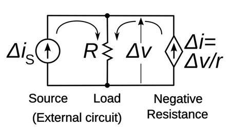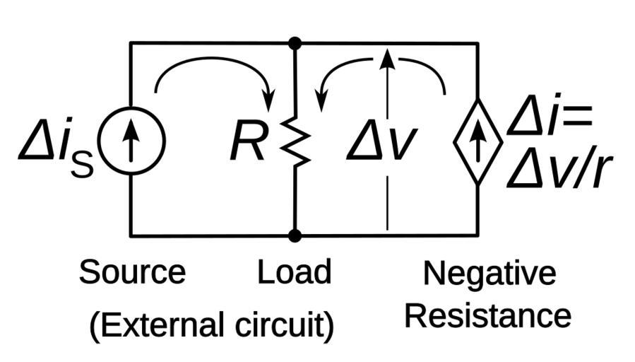 Keywords: Negative resistance AC equivalent circuit.svg negative differential resistance connected to an external circuit showing how it can amplify an applied AC signal The external circuit is represented as a current source Δi<sub>S</sub> and load resistance R The negative resistance device is biased with a DC voltage not shown which moves its operating point into its negative resistance region in which it has differential resistance Δv/Δi -r Therefore it acts like a dependent current source right with a value of Δv/r Because in a negative differential resistance the instantaneous AC voltage Δv and current Δi are 180° out of phase the direction of the current is out of the positive voltage terminal Therefore the negative resistance current Δi adds to the source current Δi<sub>S</sub> through the resistor increasing the output power own Chetvorno 2013-05-14 Negative resistance Cc-zero Resistor schemas |