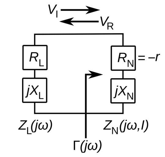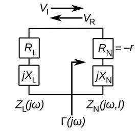 Keywords: Negative resistance circuit model.svg AC equivalent circuit of a circuit with a negative differential resistance device like a Gunn diode or a neon lamp It consists of a negative resistance device which may have reactance <math>Z_N j\omega R_N + jX_N\ </math> where <math>R_N < 0</math> and a circuit connected to it modeled as a linear impedance <math>Z_L j\omega R_L + jX_L\ </math> The voltage at the terminals of the negative resistance can be divided into an incident wave <math>V_I</math> moving toward the negative resistance and a reflected wave <math>V_R</math> moving away from it The reflection coefficient is the ratio of the incident to the reflected wave The signature of a negative resistance is that the magnitude of its reflection coefficient is greater than one <math> \Gamma \bigg V_R \over V_I \bigg \bigg Z_N - Z_L \over Z_N + Z_L \bigg > 1\ </math> 2014-08-18 09 02 43 own Chetvorno cc-zero Uploaded with UploadWizard SVG electricity Negative resistance |