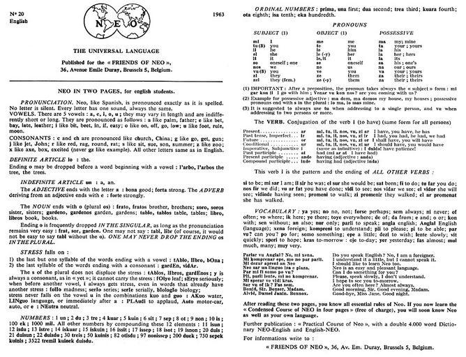 Keywords: Neo in two pages.jpg en A Neo overview in two pages created from a promotional leaflet es Una visión general de la lengua Neo de dos páginas creada de un folleto promocional en inglés own ArkinAardvark Arturo Alfandari 2009 1960s Free use for illustrative puropses Neo |