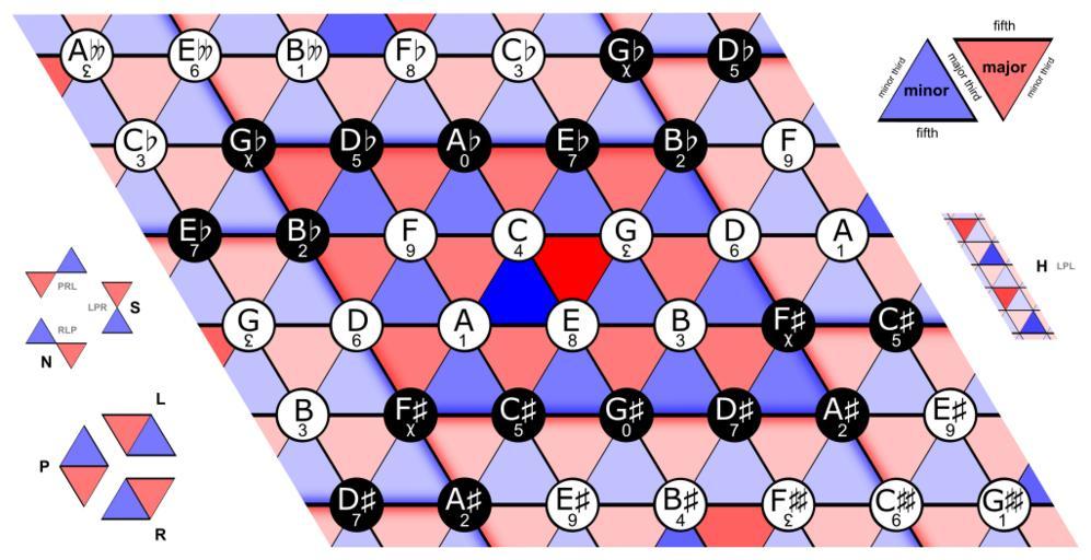 | Keywords: Neo-Riemannian Tonnetz.svg thumb right This file uses w duodecimal duodecimal digits for the keys thumb right Intervals The Neo-Riemannian Tonnetz a triangular net with keys as vertices and triads as triangles The keys are denoted by their names but also the key numbers from 0 to 11 <br> With enharmonic equivalence this triangular net forms a torus and has 12 vertices and 24 triangles <br> Unlike many tori the left edge of the repeated parallelogram corresponds only to a part of the right edge B ™-D-F ™¯ Major triads are red minor triads are blue <br> Thin lines stand for minor thirds major sixths thicker lines for major thirds minor sixths The even thicker horizontal lines stand for fifths fourths The relationship between triads whose triangles are horizontal neighbours is also seen in the circle diagram on the left <br> R relatives like <span style color blue; >a</span>/<span style color red; >C</span><br> L leading-lone exchanges like <span style color red; >F</span>/<span style color blue; >a</span> or <span style color red; >C</span>/<span style color blue; >e</span> By vertical neighbours the Tonnetz expresses another relationship <br> P parallels like <span style color blue; >a</span>/<span style color red; >A</span> and <span style color blue; >c</span>/<span style color red; >C</span> Secondary operations can be constructed by combining these basic operations RLP N nebenverwandt like <span style color blue; >a</span>/<span style color red; >E</span> or <span style color blue; >f</span>/<span style color red; >C</span> LPR S slide like <span style color red; >A ™</span>/<span style color blue; >a</span> or <span style color red; >C</span>/<span style color blue; >c ™¯</span> LPL H hexatonic pole like <span style color red; >D ™</span>/<span style color blue; >a</span> or <span style color red; >C</span>/<span style color blue; >g ™¯</span> thumb left Neighbouring triads in a circle own Mate2code Printable version File Neo-Riemannian Tonnetz pdf thumb left 400px Only numbers Music diagrams with duodecimal signs Tonnetz Cc-zero QualityImage |