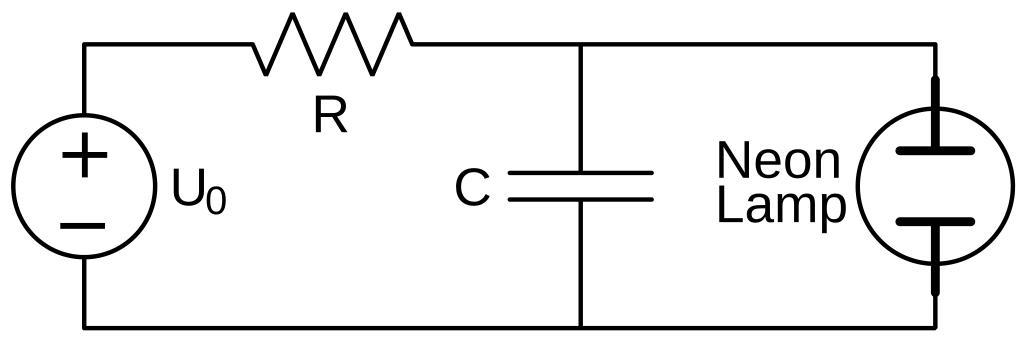 Keywords: NeonBulbRelaxationOscillator.svg Pearson-Anson oscillator a very simple type of relaxation oscillator which uses a neon bulb as a switching device with hysteresis The voltage source U charges capacitor C through resistor R The neon bulb has a very high resistance until the capacitor voltage reaches its breakdown voltage V<sub>br</sub> at which it conducts and discharges the capacitor and the cycle repeats it Semplice circuito di un Oscillatore RC a Rilassamento utilizzante una lampada al neon come dispositivo non lineare own FranzLiszt 2010-10-28 The symbol used for the neon bulb has been taken from the http //library thinkquest org/10784/circuit_symbols html List of Schematic Symbols as no free reliable sources were available to check for IEC 60617 compliance Astable circuits Neon lamps |