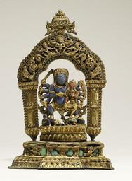 Keywords: Nepalese - Bhairava with Goddess - Walters 543024 (2).jpg This blue god of ferocious form and ten arms is Bhairava the angry manifestation of Shiva In Nepal he is popular with both Hindus and Buddhists and is also known as Mahakala His posture is somewhere in between the militant pratyalidha posture of Bhairava and the bent-kneed posture of Mahakala His stretched left leg is sufficiently bent to balance his spouse on the thigh while the right presses down on his mount who is the man nara Nine of his ten arms radiate symmetrically on either side except one that holds the skull cup against his chest The others hold various weapons and emblems By contrast his spouse only has two arms and sits in the graceful lalitasana posture although not too comfortably Her dangling left leg rests on her lion mount The right hand displays the gesture of charity and the left holds a skull cup century 18 gilt copper alloy lapis lazuli opal coral turquoise cm 25 2 16 5 9 2 accession number 54 3024 39014 de Sedley Gallery New York date and mode of acquisition unknown John and Berthe Ford Baltimore October 1965 by purchase Walters Art Museum John Berthe Ford 2006 place of origin Nepal <gallery> File Nepalese - Bhairava with Goddess - Walters 543024 jpg </gallery> Walters Art Museum license Nepalese art in the Walters Art Museum Bhairava Metalwork of Nepal |
