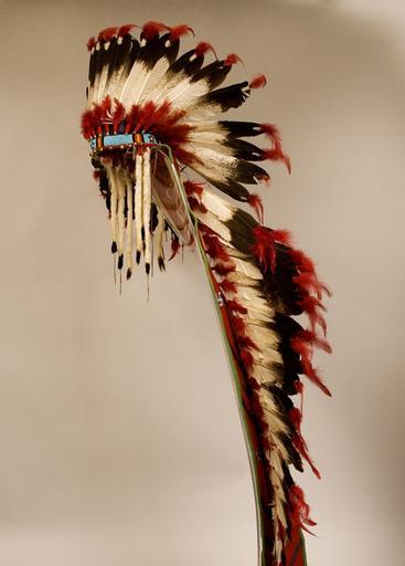 | Keywords: NEPE Head-dress.jpg en War Bonnet and Trailer The headdress was a sign of leadership and honor and was often passed down from generation to generation The headdress and trailer was probably made locally The headdress itself is built around a tan felt cap with twenty-five feathers The head band is beaded with small bells and ermine tails attached to it The trailer has twenty-six eagle feathers attached to a trailer of red trade cloth One of the designs on the trailer is of a whirlwind which Euro-American ™s often call a swastika This is an ancient symbol that appears in artwork around the world Wool eagle feathers brass L 154 W 22 3 cm Nez Perce National Historical Park NEPE 2225 Nez Perce National Historical Park NEPE 2225 Nez Perce National Historical Park 18 PD-USGov Nez Perce War bonnets Facing left Male fur headgear Ermine headgear Feathered headdresses Fur clothing of Nez Perce people |
