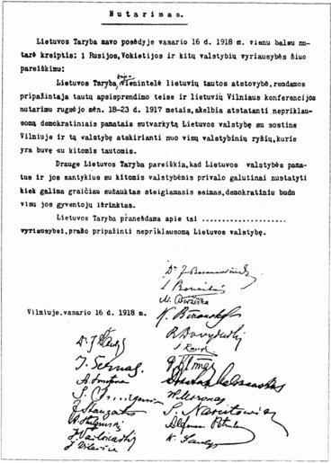 | Keywords: Nepriklausomybes aktas.gif Facsimile of the Act of Independence of Lithuania Scan from Maksimaitis Mindaugas 2005 Lietuvos valstybės konstitucijų istorija XX a pirmoji pusė Vilnius Justitia ISBN 9955-616-09-1 1918-02-16 Council of Lithuania PD-old From Parliament of Lithuania website http //www3 lrs lt/home/w5_viewer/statiniai/seimu_istorija/w5_show-p_r 598 p_d 2816 p_k 1 html PD-old 16 February 1918 Act of Independence of Lithuania Documents in Lithuanian | ||||