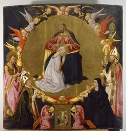 | Keywords: Neri di Bicci - The Coronation of the Virgin with Angels and Four Saints - Walters 37675.jpg On this altarpiece Christ places a crown upon the head of his kneeling mother the Virgin Mary an act symbolic of their status as King and Queen of Heaven The golden circle surrounding the couple has been engraved with different tools This ornament suggests the music of the heavenly spheres the movement of the planets believed to produce harmonies which could not be heard by humans Around the circle is a host of worshiping angels; below are Sts John the Baptist perhaps Augustine and his mother Monica and Nicholas of Bari At the bottom of the panel in the center angels kneel on either side of a painted tabernacle depicting the Crucifixion This section was cut and hinged to provide a recess in the altarpiece that may have housed the consecrated Host for use in the Mass For more information on this altarpiece please see Zeri catalogue number 54 pp 87-89 ca 1470 1475 Renaissance tempera and gold leaf on panel Painted surface cm 205 7 201 6 3 2 ; Framed cm 215 3 215 9 20 3 accession number 37 675 35571 Don Marcello Massarenti Collection Rome prior to 1897 mode of acquisition unknown 1897 catalogue no 92 as Neri di Bicci Henry Walters city Baltimore Walters Art Museum Henry Walters Acquired by Henry Walters with the Massarenti Collection 1902 Transcription In scroll held by John the Baptist ECCE AGNIVS place of origin Florence Italy Walters Art Museum license 2D Italian Renaissance paintings in the Walters Art Museum Neri di Bicci Paintings in the Walters Art Museum 15th-century paintings of Coronation of Mary 15th-century donor portraits with Madonna Donor portraits with Coronation of Virgin |