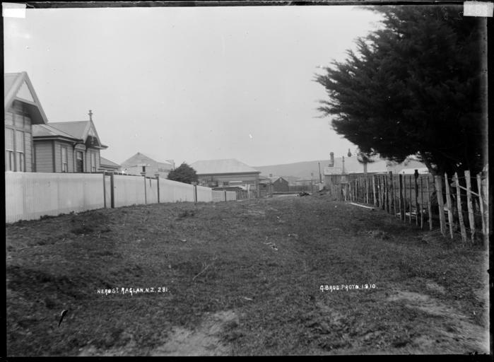 | Keywords: blackandwhite monochrome outdoor photo border black and white View along Nero Street, Raglan, with the Court House centre left, photographed in 1910, probably by Gilmour Brothers Store, Raglan (Robert Gilmour, proprietor). The street is a wide grassy strip between fences on either side. Inscriptions: Inscribed - Photographer's title on negative -bottom left: Nero St. Raglan. 281bottom right: G Bros Protd 1.8.10. Quantity: 1 b&w original negative(s). Physical Description: Dry plate glass negative 4.5 x 6.5 inches Gilmour Brothers (Firm). Nero Street, Raglan, 1910 - Photograph taken by Gilmour Brothers. Price, William Archer, 1866-1948 :Collection of post card negatives. Ref: 1/2-000927-G. Alexander Turnbull Library, Wellington, New Zealand. natlib.govt.nz/records/22796345 View along Nero Street, Raglan, with the Court House centre left, photographed in 1910, probably by Gilmour Brothers Store, Raglan (Robert Gilmour, proprietor). The street is a wide grassy strip between fences on either side. Inscriptions: Inscribed - Photographer's title on negative -bottom left: Nero St. Raglan. 281bottom right: G Bros Protd 1.8.10. Quantity: 1 b&w original negative(s). Physical Description: Dry plate glass negative 4.5 x 6.5 inches Gilmour Brothers (Firm). Nero Street, Raglan, 1910 - Photograph taken by Gilmour Brothers. Price, William Archer, 1866-1948 :Collection of post card negatives. Ref: 1/2-000927-G. Alexander Turnbull Library, Wellington, New Zealand. natlib.govt.nz/records/22796345 |