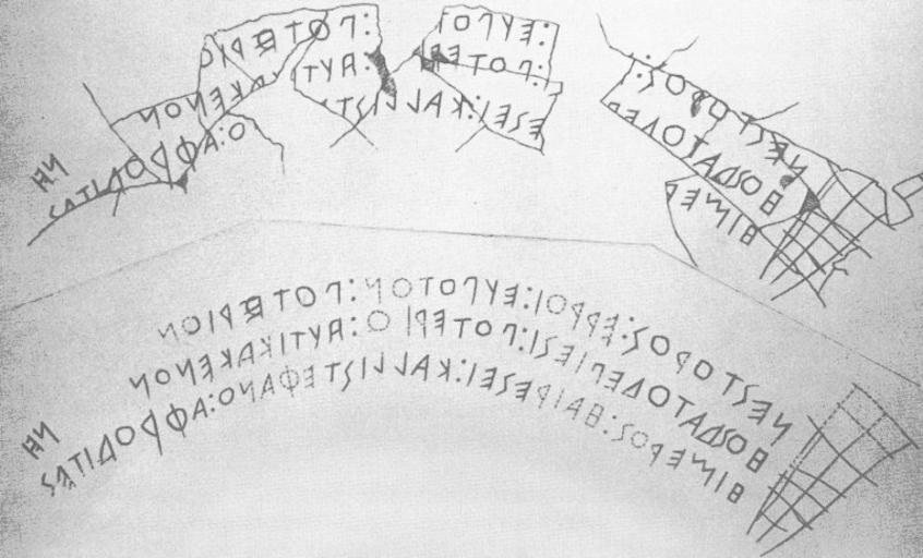 Keywords: Nestor Cup Cumae.jpg Nestor's Cup inscription Cumae alphabet 8th century BC from a Greek vase from Pithikoussai the older Greek colony in Magna Graecia and Sicily related to and often confused with Cumae upper half drawing of the state of the original inscription; lower half restoration Original ΕΣΤΟΡΟΣ ΕΥΠΟΤ ΠΟΤΕΡΙΟ ΗΟΣΔΑΤΟΔΕΠ ΠΟΤΕΡΙ ΗΥΤΙΚΑΚΕ Ο ΗΙ ΕΡ ΕΣΕΙ ΚΑΛΛΙΣΤΕ Ο ΑΦΡΟΔΙΤΕΣ Restored εστορος ἐρροι εὐ οτον οτηριον ὁσδα τοδε ιεσι οτηριο ηὐτικα κενον ἱμερος αἱρεσει καλλιστεφανο Ἀφροδιτες Source http //www1 union edu/~wareht/greek3/writing_nestor jpg PD-Art See also <gallery> Image Coppa di Nestore png The so-called Nestor's cup from Pithikoussai </gallery> Cup of Nestor Pithecusae Artworks missing infobox template |