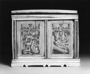 | Keywords: Netherlandish - Casket with Scenes from the Passion of Christ - Walters 71251 - Right.jpg This type of large rectangular box elaborately decorated with scenes depicting either the Passion of Christ or the Life of the Virgin was produced in great quantity in 15th-century Flanders The artist drew inspiration from contemporary woodcuts particularly the Bible of the Poor Biblia Pauperum a pictorial Bible for the illiterate first produced ca 1430 This example depicts Christ's Passion The scenes of Christ's Arrest his Carrying of the Cross Entombment Harrowing of Hell Resurrection and Appearance to Mary Magdalene have all been taken from this source The carved panels retain much of their original paint and gilding The gilded bronze lock plate on top is a 17th-century addition ca 1450 Late Medieval ivory gilt bronze paint cm 16 1 31 5 19 4 accession number 71 251 39550 Count Girolamo Possenti Fabriano Sale Raphael Dura Florence April 1 1880 no 38 F Ongania Venice Henry Walters Baltimore by purchase Walters Art Museum Henry Walters Acquired by Henry Walters place of origin Flanders Walters Art Museum license Medieval art in the Walters Art Museum Renaissance applied arts in the Walters Art Museum Art of the Netherlands Media contributed by the Walters Art Museum needs category review Biblia pauperum |