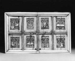 | Keywords: Netherlandish - Casket with Scenes from the Passion of Christ - Walters 71251 - Top.jpg This type of large rectangular box elaborately decorated with scenes depicting either the Passion of Christ or the Life of the Virgin was produced in great quantity in 15th-century Flanders The artist drew inspiration from contemporary woodcuts particularly the Bible of the Poor Biblia Pauperum a pictorial Bible for the illiterate first produced ca 1430 This example depicts Christ's Passion The scenes of Christ's Arrest his Carrying of the Cross Entombment Harrowing of Hell Resurrection and Appearance to Mary Magdalene have all been taken from this source The carved panels retain much of their original paint and gilding The gilded bronze lock plate on top is a 17th-century addition ca 1450 Late Medieval ivory gilt bronze paint cm 16 1 31 5 19 4 accession number 71 251 39550 Count Girolamo Possenti Fabriano Sale Raphael Dura Florence April 1 1880 no 38 F Ongania Venice Henry Walters Baltimore by purchase Walters Art Museum Henry Walters Acquired by Henry Walters place of origin Flanders Walters Art Museum license Medieval metalwork in the Walters Art Museum Renaissance applied arts in the Walters Art Museum Art of the Netherlands Media contributed by the Walters Art Museum needs category review Biblia pauperum |