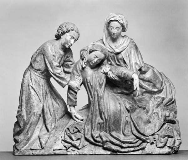 | Keywords: Netherlandish - Figures from a Deposition - Walters 61147.jpg In this group from a carved altarpiece Walters 61 148 Mary swoons in a visual echo of the dead body of Christ - her suffering paralleling his suffering The figures loosely derived from the great painter Rogier van der Weyden's famous altarpiece of the Deposition of around 1442 for the Church of Our Lady Outside the Walls in Louvain in present day Belgium This piece was carved at the same time as its companion piece focused on the dead body of Christ Walters 61 148 Van der Weyden set out to imitate the three-dimensional modeling and shallow box-like space of contemporary sculpted wooden altarpieces The sculptural quality of his painted masterpiece made it in turn an especially effective model for sculptors ca 1475 Late Medieval paint on wood oak cm 32 5 39 5 11 5 accession number 61 147 4675 Arnold Seligmann Rey and Co New York Henry Walters Baltimore December 1919 by purchase Walters Art Museum Henry Walters Acquired by Henry Walters 1919 Rogier van der Weyden Musée Communal de Bruxelles Brussels 1979 Salute to Belgium place of origin Brussels Belgium Walters Art Museum license Salute to Belgium Medieval art in the Walters Art Museum Renaissance sculpture in the Walters Art Museum Art of the Netherlands Fainting Virgin Mary |