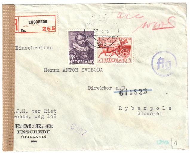 Keywords: Netherlands 1943-10-27 censored cover.jpg Slovak Republic Opened by censor and closed by brown censor tape left Backside Slovakian label 'CENZUROVANÉ' censored affixed and arrival postmark 21 XI 43 almost one month later Catalogue NVPH 415 and 422 / Mi 415 and 422 1943-10-27 own scan Post of the Netherlands other versions See more images Netherlands 1943-10-27 censored cover jpg Netherlands 1943-10-27 censored cover reverse jpg LangSwitch Netherlands 1943-10-27 censored cover to Slovak Republic Custom license marker 2016 09 15 PD-old Covers of the Netherlands 1943 Ružomberok Censored covers of the Netherlands Postmarks of the Netherlands Registration labels of the Netherlands |