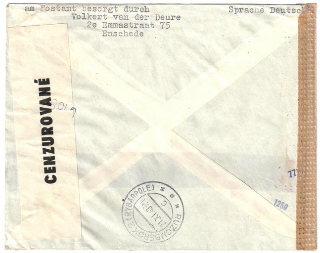 Keywords: Netherlands 1943-10-27 censored cover reverse.jpg Slovak Republic Opened by censor and closed by brown censor tape left Backside Slovakian label 'CENZUROVANÉ' censored affixed and arrival postmark 21 XI 43 almost one month later 1943-10-27 own scan Post of the Netherlands other versions See more images Netherlands 1943-10-27 censored cover jpg Netherlands 1943-10-27 censored cover reverse jpg LangSwitch Netherlands 1943-10-27 censored cover to Slovak Republic Custom license marker 2016 09 15 PD-old Covers of the Netherlands 1943 Censored covers of the Netherlands Postmarks of Ružomberok |