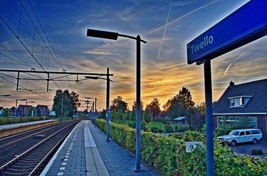 Keywords: netherlands landscape sky clouds hdr buildings houses homes station depot platform trees railroad railway tracks transportation outside country countryside summer spring sunset