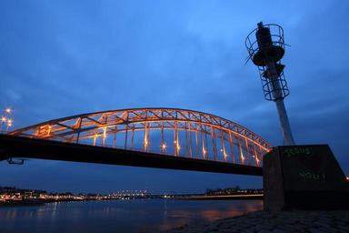 Keywords: netherlands nijmegen bridge traffic waal river evening waalbrug gelderland steel structure crossing arch