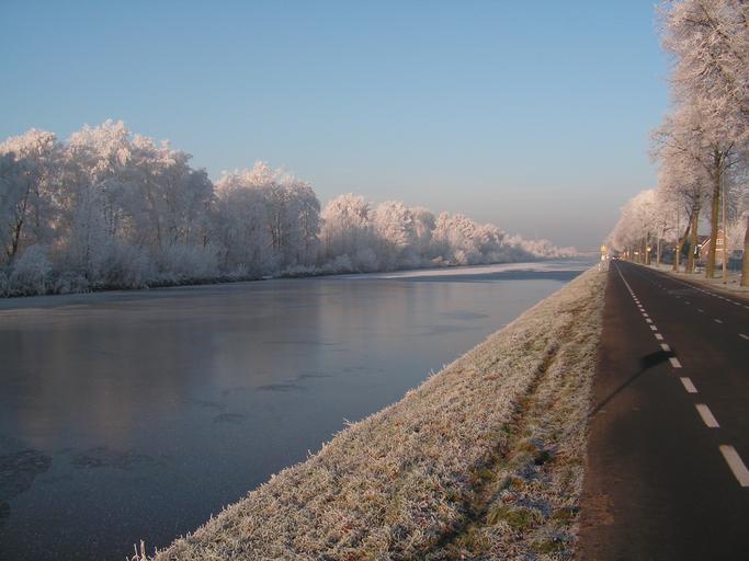 Keywords: netherlands river water reflections waterway forest trees woods winter snow ice hoar frost sky clouds scenic nature outside country countryside