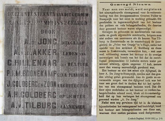 Keywords: Netherlands, Stompwijk, Grote Drooggemaakte Polder (3).JPG Gemaal De Volharding te Stompwijk Gemeente Leidschendam-Voorburg Prov Zuid-Holland De steen herinnert aan het leggen van de eerste stenen van dit gemaal op 22 mei 1882 Het gemaal diende ter bemaling van de Drooggemaakte Grote Polder en zou de plaats innemen van een molendriegang Rechts Artikel uit het Leidsch Dagblad van 30 septempber 1882 over de officiƫle ingebruikname van het gemaal In dit artikel komen diverse namen voor die ook op de gevelsteen zijn terug te vinden Het artikel meldt dat het gemaal A de Jong gaat heten doch deze naam is hooguit korte tijd gebruikt omdat het gemaal al snel De Volharding werd genoemd en ook als zodanig op oude foto's staat pumping station De Volharding in Stompwijk Municipality of Leidschendam-Voorburg Prov South Holland Netherlands The plaque commemorates the laying of the first stone of the station on 22 May 1882 It was designed to drain the Reclaimed Large Polder and would take the place of three wind mills At right Newspaper article from the Leidsch Dagblad of 30 September 1882 on the official inauguration of the pumping station Various names mentioned in this article can be found on the memorial plaque The article reports that the pumping station will be called A de Jong but this name has been used for a short time only if at all because the pumping station was soon called De Volharding and appears as such on old photographs Picture own The newspaper article comes from http //www archiefleiden nl/home/collecties/kranten/zoeken-in-kranten to be more precise http //leiden courant nu/issue/LD/1882-04-21/edition/0/page/1 Leidsch Dagblad 1882 Picture Vincent van Zeijst Newspaper article anonymous in Leidsch Dagblad 1882 2012 and 1882 The newspaper article on the right is in the public domain In the Netherlands copyright expires 70 years after the first publication in the case of anonymous or pseudonymous works or works published by a legal entity Het auteursrecht in Nederland vervalt 70 jaar na de eerste openbaarmaking van het werk indien het gaat om een anoniem of om een onder pseudoniem verschenen werk of werk van een rechtspersoon The pumping station is located at 52 5 41 13 N 4 26 58 61 E region NL Stompwijk Polders in the Netherlands Pumping stations in South Holland Plaques in the Netherlands Leidsch Dagblad 1882 in the Netherlands cc-by-sa-3 0 PD-old-70