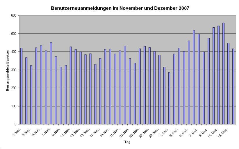 Keywords: Neue Benutzer November Dezember 2007.png Account creations at the German language Wikipedia in Novemver and December 2007 Benutzerneuanmeldungen im November und Dezember 2007 in der deutschsprachigen Wikipedia am 6 Dezember war der Stern-Vergleich an den Kiosken erhältlich Daten <br /> 1 Nov 420 / 2 Nov 368 / 3 Nov 324 / 4 Nov 422 / 5 Nov 436 / 6 Nov 406 / 7 Nov 452 / 8 Nov 374 / 9 Nov 316 / 10 Nov 325 / 11 Nov 427 / 12 Nov 412 / 13 Nov 399 / 14 Nov 384 / 15 Nov 389 / 16 Nov 330 / 17 Nov 363 / 18 Nov 414 / 19 Nov 415 / 20 Nov 388 / 21 Nov 406 / 22 Nov 431 / 23 Nov 363 / 24 Nov 337 / 25 Nov 417 / 26 Nov 430 / 27 Nov 423 / 28 Nov 402 / 29 Nov 381 / 30 Nov 315 / 1 Dez 286 / 2 Dez 388 / 3 Dez 421 / 4 Dez 402 / 5 Dez 460 / 6 Dez 519 / 7 Dez 498 / 8 Dez 399 / 9 Dez 475 / 10 Dez 533 / 11 Dez 543 / 12 Dez 559 / 13 Dez 447 / 14 Dez 417 own 2007-12-15 Toffel German Wikipedia statistics |