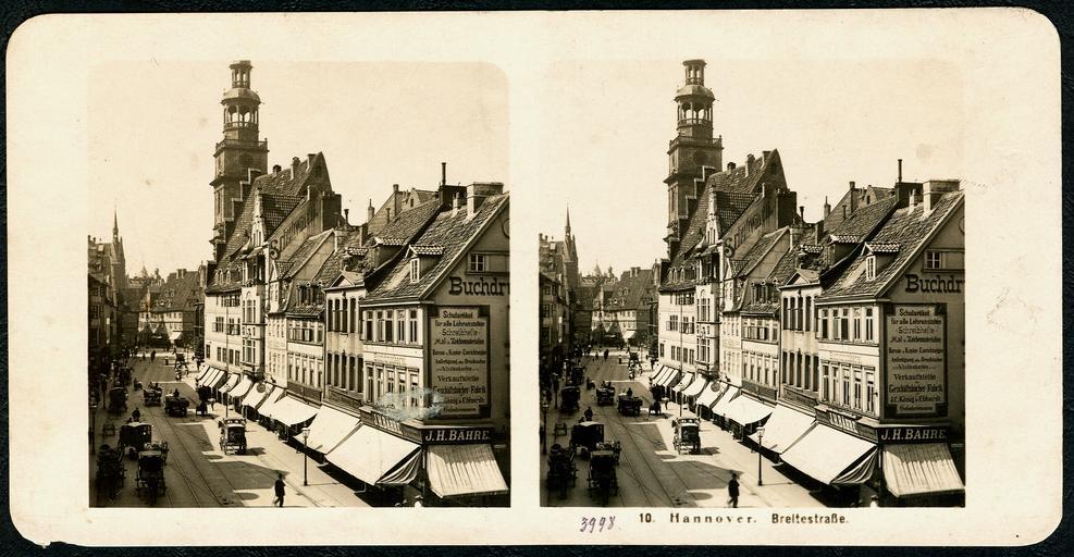 Keywords: Neue Photographische Gesellschaft Stereoskopie 1907, Hannover 10 Breitestraße Bildseite Große Wallstraße Georgswall Alte Kanzlei Aegidienkirche Köbelingerstraße Buchdruckerei J. H. Bähre König & Ebhardt.jpg Bildseite mit der laufenden Nummer 10 aus der ab 1907 von der Neuen Photographischen Gesellschaft AG Berlin-Steglitz vertriebenen Stereoskopie-Kartenserie Hannover Der noch unidentifizierte Fotograf stand hier erhöht vor der Ecke Große Wall Straße heute Georgswall wo die Buchdruckerei J H Bähre ihre Produkte und Dienstleistungen anpries Zitat Schulartikel für alle Lehranstalten Schreibhefte Mal- und Zeichenmaterialien Bureau- und Kontor-Einrichtungen Anfertigung aller Drucksachen Visitenkarten usw Verkaufsstelle der Geschäftsbücher-Fabrik von J C König Ebhardt Galanteriewaaren Der Blick geht durch die Breitestraße vorbei an einigen älteren zum Teil in Fachwerk errichteten Gebäuden deren Aufschrift auch elektronisch bisher nicht lesbar gemacht werden konnten Zur Identifizierung wird die bis Ende 2014 vom Stadtarchiv Hannover und der Gottfried Wilhelm Leibniz Bibliothek - Niedersächsische Landesbibliothek geplante vollständige Digitalisierung sämtlicher Adressbücher der Stadt hilfreich sein Hinter dem Gebäude mit der Aufschrift Schuhwaren ist der Staffelgiebel der Alten Kanzlei an der Osterstraße zu erkennen die hier noch nicht bis zum heutigen Friedrichswall durchgebrochen wurde Hinter dem Turm der Aegidienkirche geht der Blick auf das Gebäude an der Ecke Köbelingerstraße und Marktstraße Noch nicht eindeutig geklärt sind die beiden über den Dächern emporragenden Turmspitzen Während die Straßenlaternen an den Fußgängerwegen wohl noch mit Gas der Imperial Continental Gas Association betrieben wurden deutet die die über der Straße aufgehängten Kabel auf den Beginn der elektrischen Straßenbeleuchtung Die Straße durch die die Straßenbahnschienen führen wird belebt durch zahlreiche Pferdekutschen und Menschen teils mit Handkarren Diese Karte wurde freundlicherweise von Ilse Paul zur Verfügung gestellt um sie als Digitalisat über Wikimedia Commons nachhaltig allen Menschen zur Verfügung zu stellen Scan vom Original Bernd Schwabe mit Dank an die Stifterin Ilse Paul ~ 1907 unknown photographer to Neue Photographische Gesellschaft Berlin unidentified people of осква <gallery> File Neue Photographische Gesellschaft Stereoskopie 1907 Hannover 10 Breitestraße Rückseite mit Namen der Gesellschaft und Erst-Vertriebsdatum blauer Stempel Moskau russisch handschriftliche Notzi jpg Rückseite der Karte mit blauem Stempel Hinweis auf Moskau und handschriftlicher Notiz in russischer Sprache </gallery> pd-old Neue Photographische Gesellschaft Berlin Stereo cards of Hannover J H Bähre Hannover König Ebhardt Alte Kanzlei Hannover Aegidienkirche Hannover Köbelingerstraße Hannover Georgswall Hannover Horses in Hannover People of Moscow Carriages in Germany Documents by Ilse Paul |