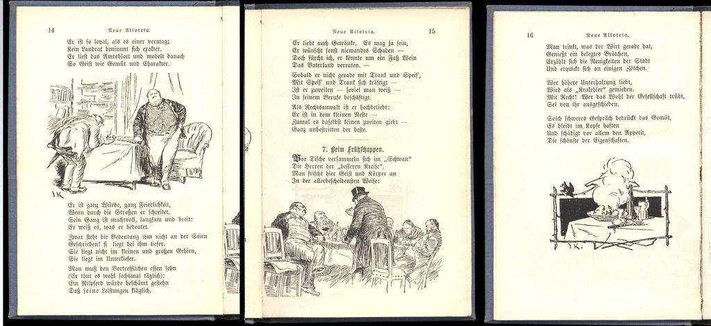 Keywords: NeueAllotria0006h.jpg Georg Bötticher eigener Scan des Buches User Wefo 2011-03-12 This image is in the public domain due to its age Inhalt <ref>vorhergehende Seiten 11 12 13 Abbildung File blau jpg File NeueAllotria0006h jpg dieser Seiten 14 15 16 nachfolgende Seiten 17 18 19 Inhaltsverzeichnis Titelblatt </ref><ref> Erste Strophen von Nr 6 siehe vorhergehende Seite </ref><ref>Er ist so loyal als es einer vermag; <br>Kein Landrat benimmt sich exakter <br>Er liest das Amtsblatt und modelt danach <br>So Geist wie Gemüt und Charakter </ref><ref>Er ist ganz Würde ganz Feierlichkeit <br>Wenn durch die Straßen er schreitet <br>Sein Gang ist machtvoll langsam und breit <br>Er weiß es was er bedeutet </ref><ref>Zwar steht die Bedeutung ihm nicht an der Stirn <br>Geschrieben sie liegt bei ihm tiefer <br>Sie liegt nicht im kleinen und großen Gehirn <br>Sie liegt im Unterkiefer </ref><ref>Man muß den vortrefflichen essen sehn <br> Er thut es wohl sechsmal täglich <br>Ein Nilpferd würde beschämt gestehn <br>Daß seine Leistungen kläglich </ref><ref>Er liebt auch Getränke Es mag ja sein <br>Er wünscht sonst niemandes Schaden ” <br>Doch fürcht ich er könnte um ein Faß Wein <br>Das Vaterland verraten ” </ref><ref>Sobald er nicht gerade mit Trank und Speis' <br>Mit Speis' und Trank sich kräftigt ” <br>Ist er zuweilen ” soviel man weiß ” <br>In seinem Berufe beschäftigt </ref><ref>Als Rechtsanwalt ist er hochbeliebt <br>Er ist in dem kleinen Neste ” <br>Zumal es daselbst keinen zweiten gibt ” <br>Ganz unbestritten der beste <br> ” </ref><ref>7 Beim Frühschoppen </ref><ref>Vor Tische versammeln sich im žSchwan <br>Die Herren der žbesseren Kreise <br>Man frischt hier Geist und Körper an <br>In der allerbescheidensten Weise </ref><ref>Man trinkt was der Wirt gerade hat <br>Genießt ein belegtes Brötchen <br>Erzählt sich die Neuigkeiten der Stadt <br>und erquickt sich an einigen Zötchen </ref><ref>Wer höhere Unterhaltung liebt <br>Wird als žKrakehler gemieden <br>Mit Recht Wer das Wohl der Gesellschaft trübt <br>sei von ihr ausgeschieden </ref><ref>Solch schweres Gespräch bedrückt das Gemüt <br>Es bleibt im Kopfe haften <br>Und schädigt vor allem den Appetit <br>Die schönste der Eigenschaften </ref><ref>8 Die zwei Vereine </ref> Inhalt <references /> PD-old Neue Allotria |