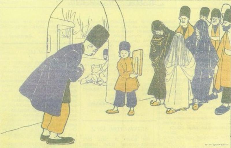 Keywords: New bride. Molla Nasreddin.jpg en Molla Nasreddin magazine on Azeri published between 1906-1931<br> Respect to the new bride http //www artfagcity com/2010/09/15/img-mgmt-molla-nasreddin-the-magazine-that-wouldve-couldve-shouldve/ www artfagcity com Creator Oskar Shmerling - 1906 1917 PD-old Molla Nasreddin Marriage of Azerbaijan in art |